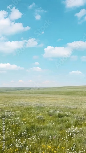 © lililia, Obraz premium A panoramic view of rolling green hills and meadows under a bright blue sky dotted with puffy white clouds