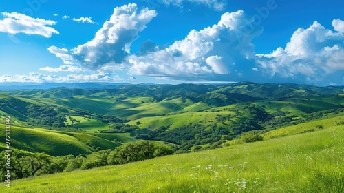 © Zainab, Obraz premium A panoramic view of rolling green hills and meadows under a bright blue sky dotted with puffy white clouds