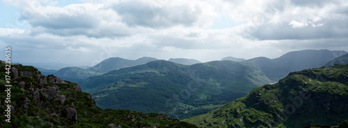 © Oleksii, Fototapeta premium A panoramic view of rolling green hills and mountains, some capped with rocks, in the Gap of Dunloe in County Kerry, Ireland, under a cloudy sky during the daytime.
