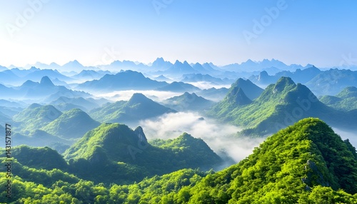 © Nur, Naklejka premium A panoramic view of rolling green hills and mountains with a layer of mist and fog