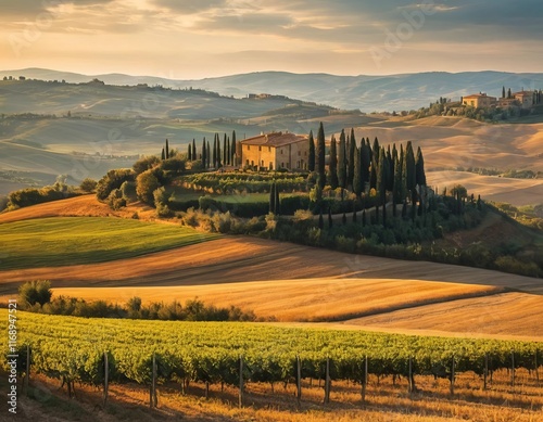 Naklejka premium A panoramic view of rolling hills and fields in Tuscany, Italy during autumn with warm sunlight shining down