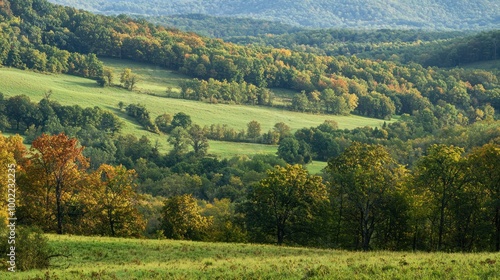 Fototapeta premium A panoramic view of rolling woodland hills, with trees and foliage creating a...