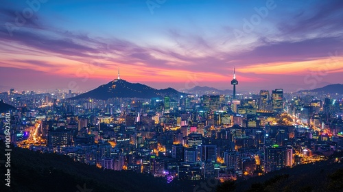 Naklejka premium A panoramic view of Seoul's night skyline, featuring glittering high-rises,...