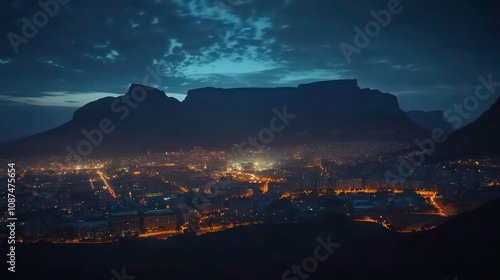 © sablengjago, Obraz premium A panoramic view of Table Mountain at dusk, with the city lights of Cape Town twinkling below.