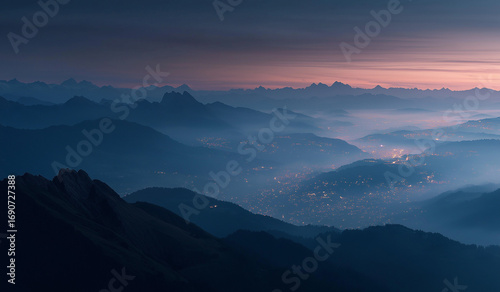 © Iqra, Obraz premium a panoramic view of the alps at night, with misty mountains and city lights in the distance. the sky is painted in soft pastel hues as the sun sets behind them,