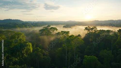 © Sirichat. Camphol, Obraz premium A panoramic view of the Amazon at dawn, mist rising above the treetops,