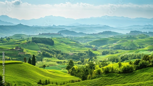 Fototapeta premium A panoramic view of the Chinese countryside with rolling hills and farmlands....