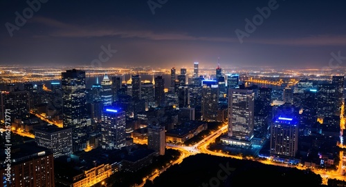 © sevenSkies, Obraz premium A panoramic view of the city at night with lights outlining each building