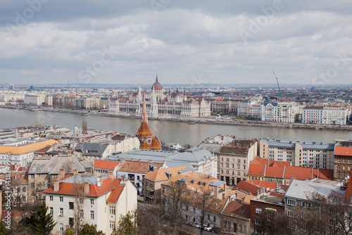 Fototapeta premium A panoramic view of the city of Budapest in Hungary over the river Danube as seen from Buda Castle; with the parliament building.