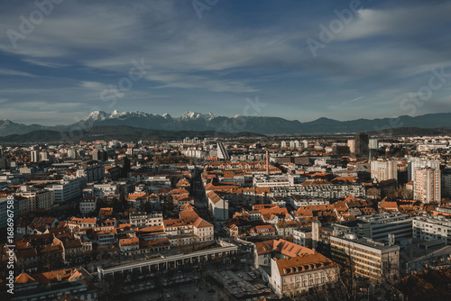 Obraz premium A panoramic view of the city of Ljubljana, with its red roofs and historic architecture, set against the majestic, snow-capped Julian Alps.