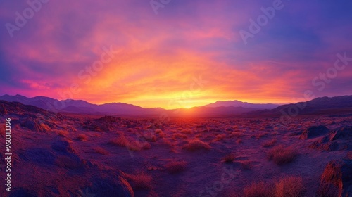 Fototapeta premium A panoramic view of the desert at sunset, with the sky painted in deep...