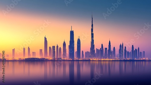 Naklejka premium A panoramic view of the Dubai skyline at sunset, showing the iconic...