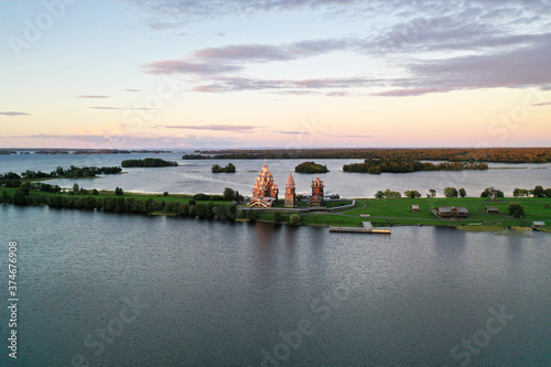 © константин константи, Fototapeta premium a panoramic view of the green islands on the lake with ships with ancient architectural buildings filmed from a drone