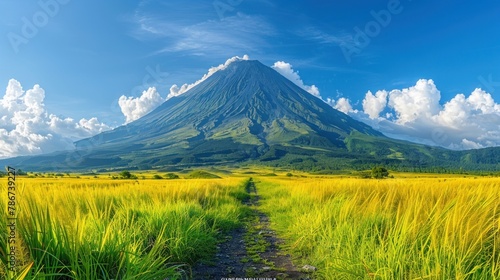© 2D_Jungle, Fototapeta premium A panoramic view of the iconic Mayon Volcano, with its perfectly symmetrical cone rising majestically above the surrounding landscape