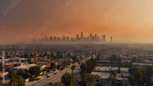 Naklejka premium A panoramic view of the Los Angeles skyline shrouded in smoke from nearby wildfires, with a glowing orange horizon, emphasizing the impact of the disaster on urban life,Generative Ai