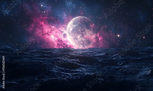 Fototapeta premium A panoramic view of the moon’s surface with reflections of distant stars
