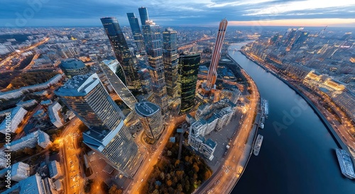 © Kien, Obraz premium A panoramic view of the Moscow City business district at sunset, showcasing its impressive skyline with towering skyscrapers and modern architecture, illuminated by vibrant city lights.