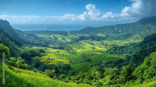 Fototapeta premium A panoramic view of the sprawling rice paddies of Lombok Island, Indonesia,...