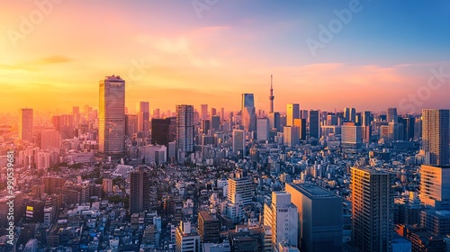 © Galib, Obraz premium A panoramic view of the Tokyo skyline at sunset, showcasing modern architecture.