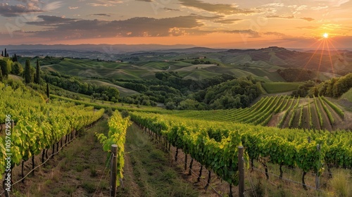 © Khoiril, Fototapeta premium A panoramic view of the vineyards at sunset, with rows of grapevines stretching across rolling hills and fields.