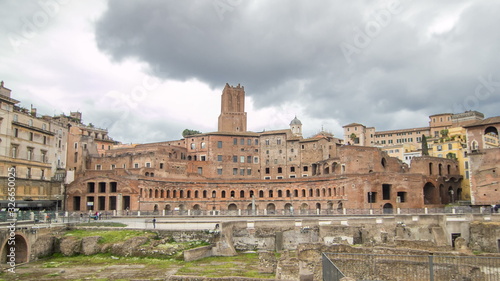 Obraz premium A panoramic view on Trajan's Market timelapse on the Via dei Fori Imperiali, in Rome, Italy