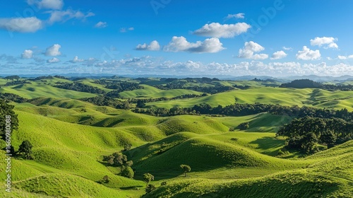 Fototapeta premium A panoramic view showcases rolling green hills under a vibrant blue sky...