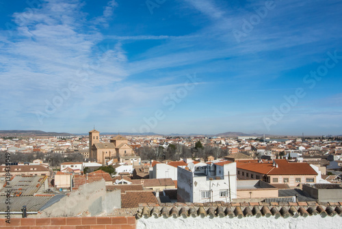 Obraz premium A panoramic view to spanish town Consuegra (Castilla-La Mancha) over the orange tile roofs on sunny day.