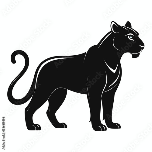 Obraz premium a panther in side profile with sleek body, alert stance, and curved tail, minimalist vector illustration isolated on white background, ideal for wild animal graphics, predator-themed artwork, and stro