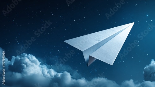 Fototapeta premium A paper airplane soars through the night sky, stars twinkling and clouds...