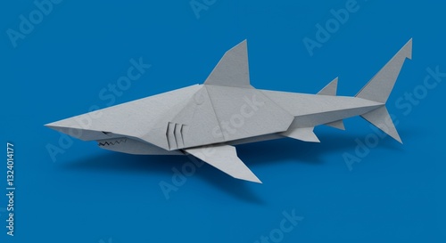© goesti, Fototapeta premium A paper crafted origami shark floating above an ocean blue backdrop