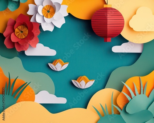 © Creator88, Naklejka premium A papercut lotus pond adorned with origamistyle dumplings and Chinese New Year symbols
