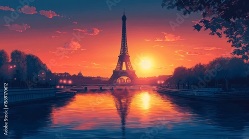 © Q STOCK, Fototapeta premium A Paris city view with generic tower at sunset, with calm river reflecting colorful sky