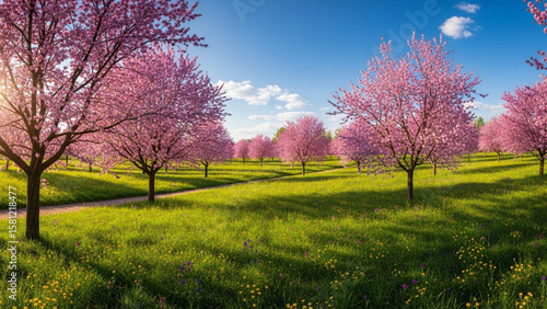 © creativenationstudio, Fototapeta premium A park filled with blooming cherry blossom trees in spring