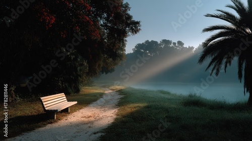© yeandita, Obraz premium A park scene at dawn with a bench, a path, a lake, fog, and sunbeams