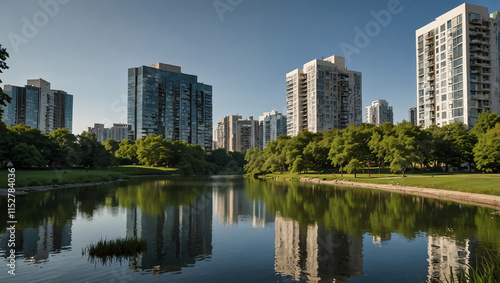 Obraz premium A park with a calm lake reflecting tall buildings, lush green trees, and...