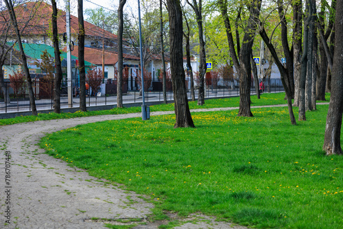 © Iurii Gagarin, Fototapeta premium A park with a path and trees. Background with copy space for text