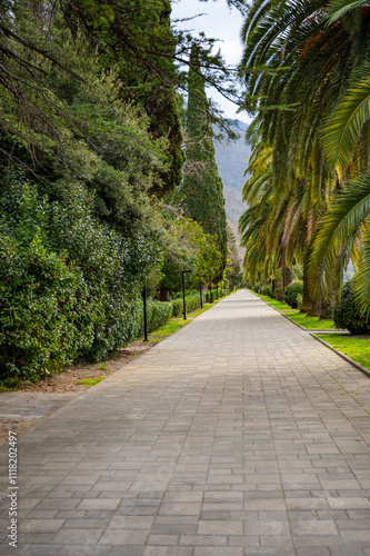 © dbrus, Fototapeta premium A park with a path lined with trees and benches