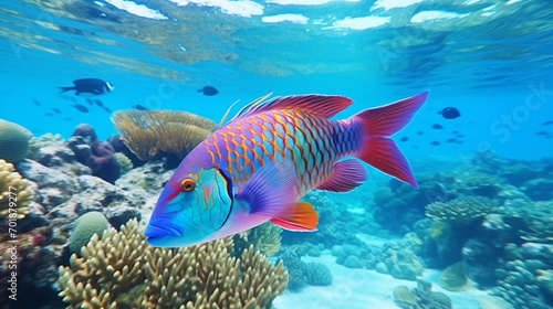 © Mehran, Naklejka premium A Parrotfish displaying its incredible color-changing ability, transitioning from one vibrant hue to another, set against a pristine reef background.