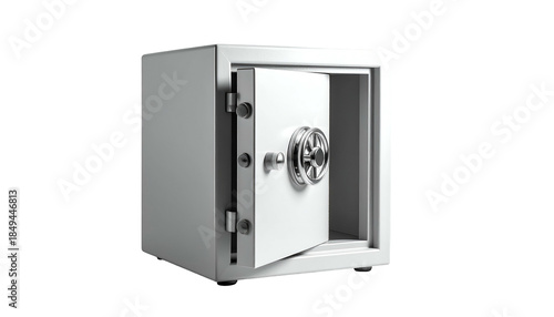 © Tarra, Fototapeta premium A partially open, empty steel safe, against a black background