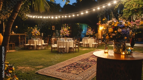© WITTAYA ANGMUJCHA, Obraz premium A party setup before guests arrive, showing neatly arranged tables, decorations, and an inviting atmosphere.