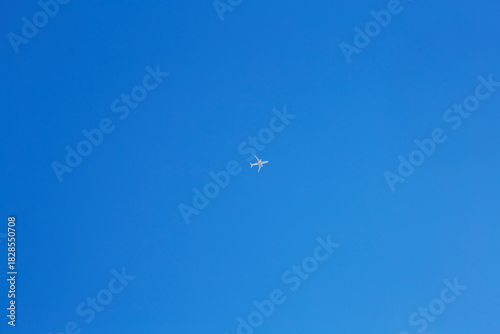 © Antonio, Fototapeta premium A passenger jet flies high across a bright clear blue sky with no clouds