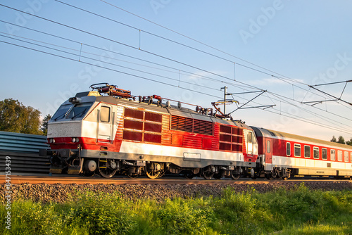 Naklejka premium A passenger train traveling on an electrified railway, in Slovakia.