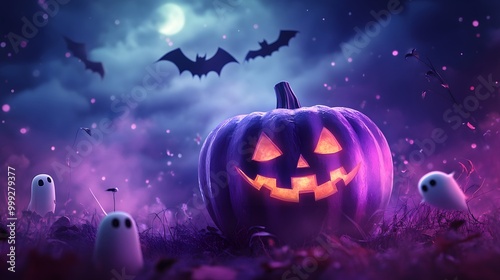Fototapeta premium A pastel purple pumpkin with a smiling face surrounded by little ghosts and bats in the sky