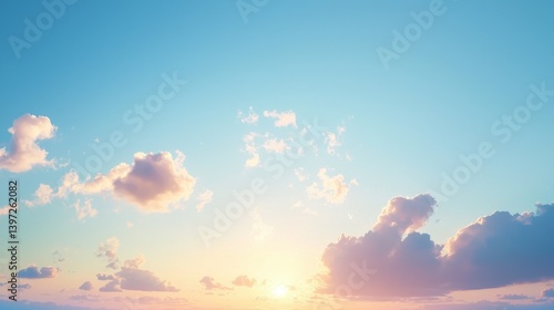 © iam, Naklejka premium A pastel sunset sky filled with fluffy clouds.