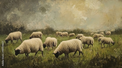 © rawdesign, Fototapeta premium A Pastoral Landscape with a Flock of Sheep Grazing in a Field