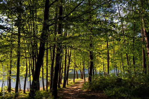 Obraz premium A path between green trees leading to the lake