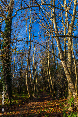Fototapeta premium A path covered in fallen leaves winds through a forest of bare trees against a bright blue sky.