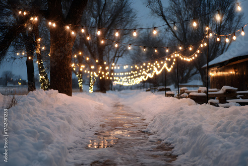 © Le, Fototapeta premium a path covered in snow with lights strung from it