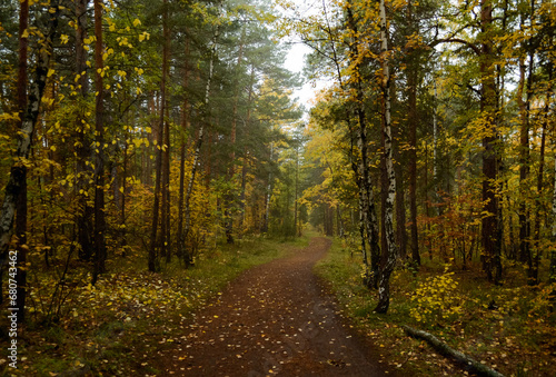 Naklejka premium A path deep in the dense autumn forest in the morning