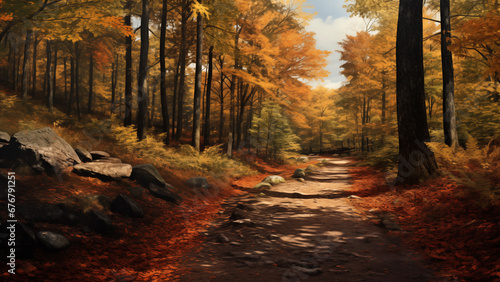 Fototapeta premium A path in a beautiful forest with warm autumn sunlight